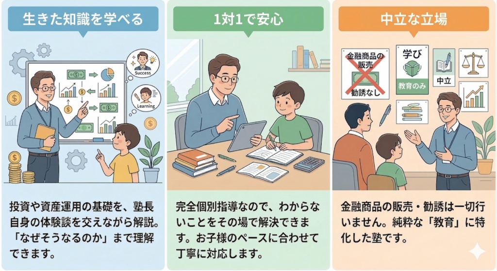 A. 一切ありません。当塾は純粋な「教育」に特化しており、金融商品の販売・勧誘は行いません。