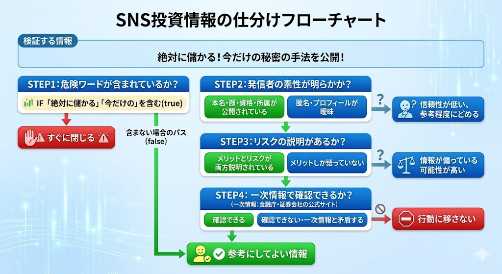 SNSの投資情報を見極めるためには、「どんな情報が危険か」を知るより先に、「なぜその情報が危険なのか」という構造を理解することが重要です。構造がわかれば、初めて見る情報でも自分で判断できる力が育ちます。ここでは、危険な投資情報に共通する3つの構造的特徴を整理します。