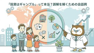 「ギャンブルは勝ち負けがランダムに決まるもの。でも投資は、会社や経済の成長に乗っかるもので、長い時間をかけると世界全体の経済は成長してきた実績がある。短期間の値動きはギャンブルに見えることもあるけど、長期の積立はギャンブルとは本質的に違うよ。」